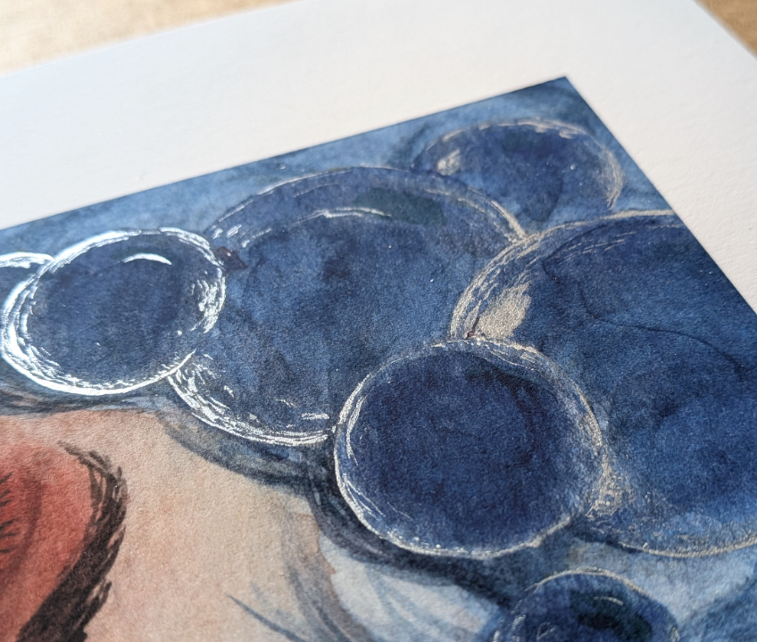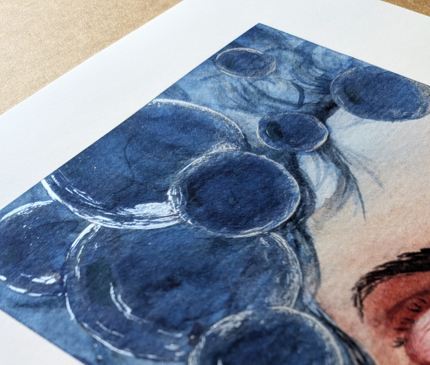 Because the original image included metallic accents, each print will be uniquely hand embellished by me with silver metallic watercolors. Embellishments will vary between prints