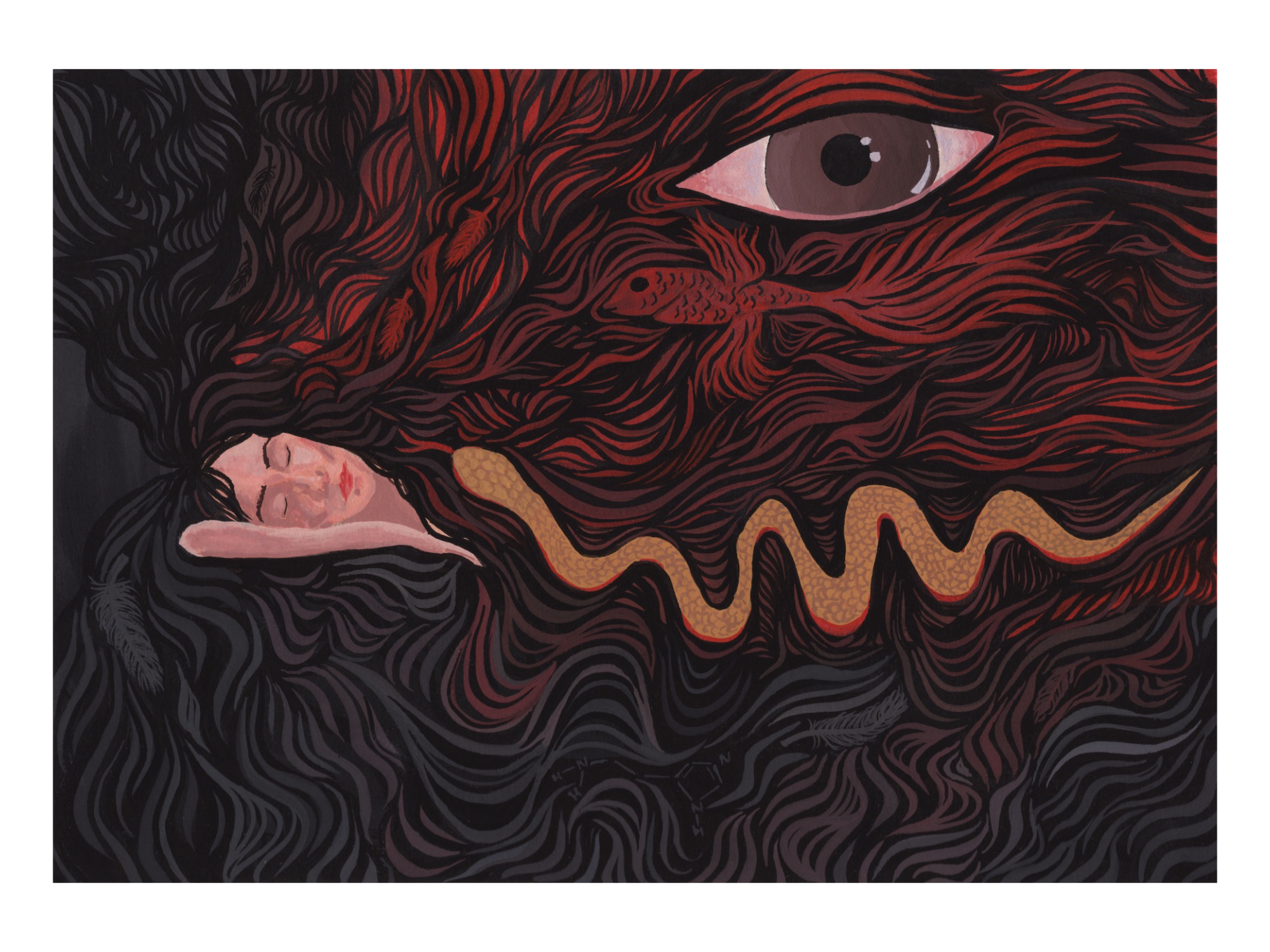 LDN was painted after a particularly vivid dream I had as a side effect of a new medication. It includes motifs from my dream, in a modified Zorn palette to convey the muted nature of my daytime life. Hidden in this piece is the chemical composition of histamine, a molecule that was ruling my life for quite some time.