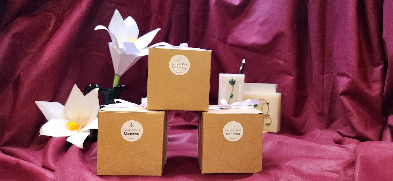 Madonna is paired with a lovely Madonna Lily origami. This origami is made by folding two triangle pieces of paper into three petal lilies. Combining them to make a six petal flower. Then some yellow paper is added to the center for the stigma and anthers. Pencil is used for a touch of color on the white petals. Curling the petals is the finishing touch.